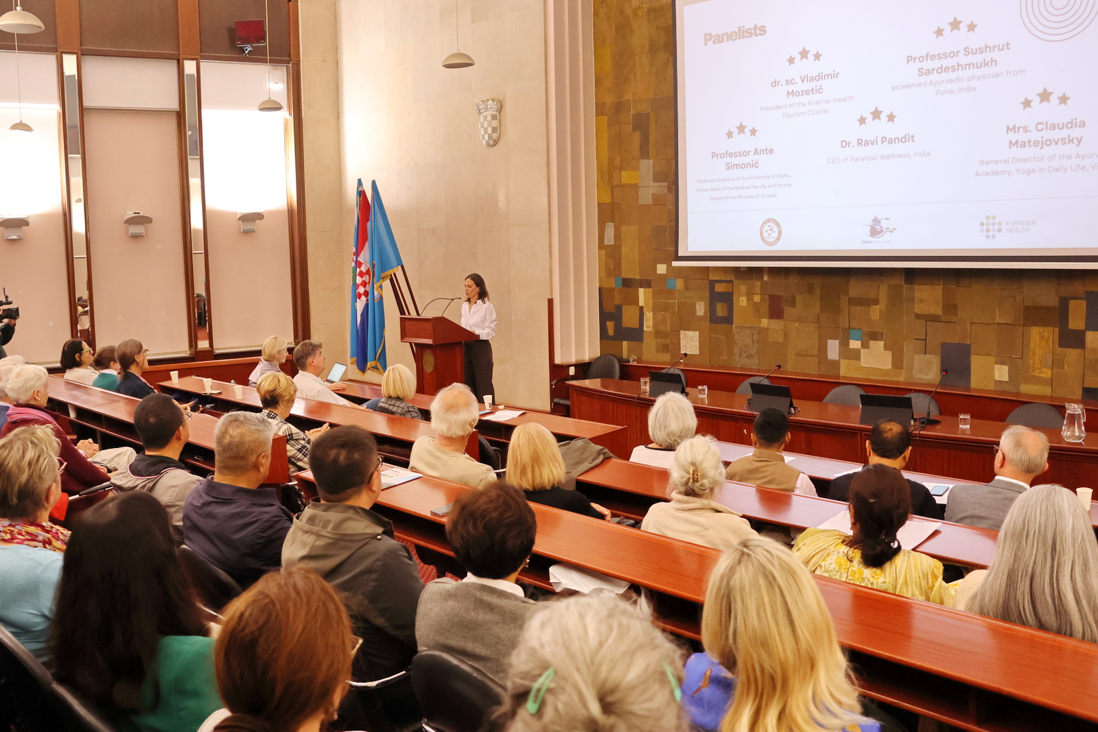 Među sudionicima bili su prof. dr. Ante Simonić, profesor emeritus Medicinskog fakulteta u Rijeci i bivši potpredsjednik Vlade RH, dr. sc. Vladimir Mozetič, predsjednik Klastera zdravstvenog turizma Kvarnera, dr. Ravi Pandit, izvršni direktor Patanjali Wellness iz Indije, prof. dr. Sushrut Sardeshmukh, međunarodno priznati ayurvedski liječnik, te Claudia Matejovsky, generalna direktorica Ayurveda Academy iz Beča.